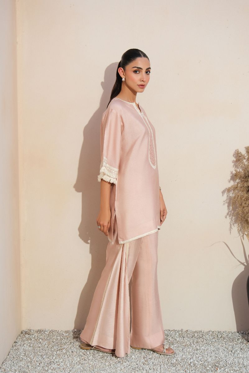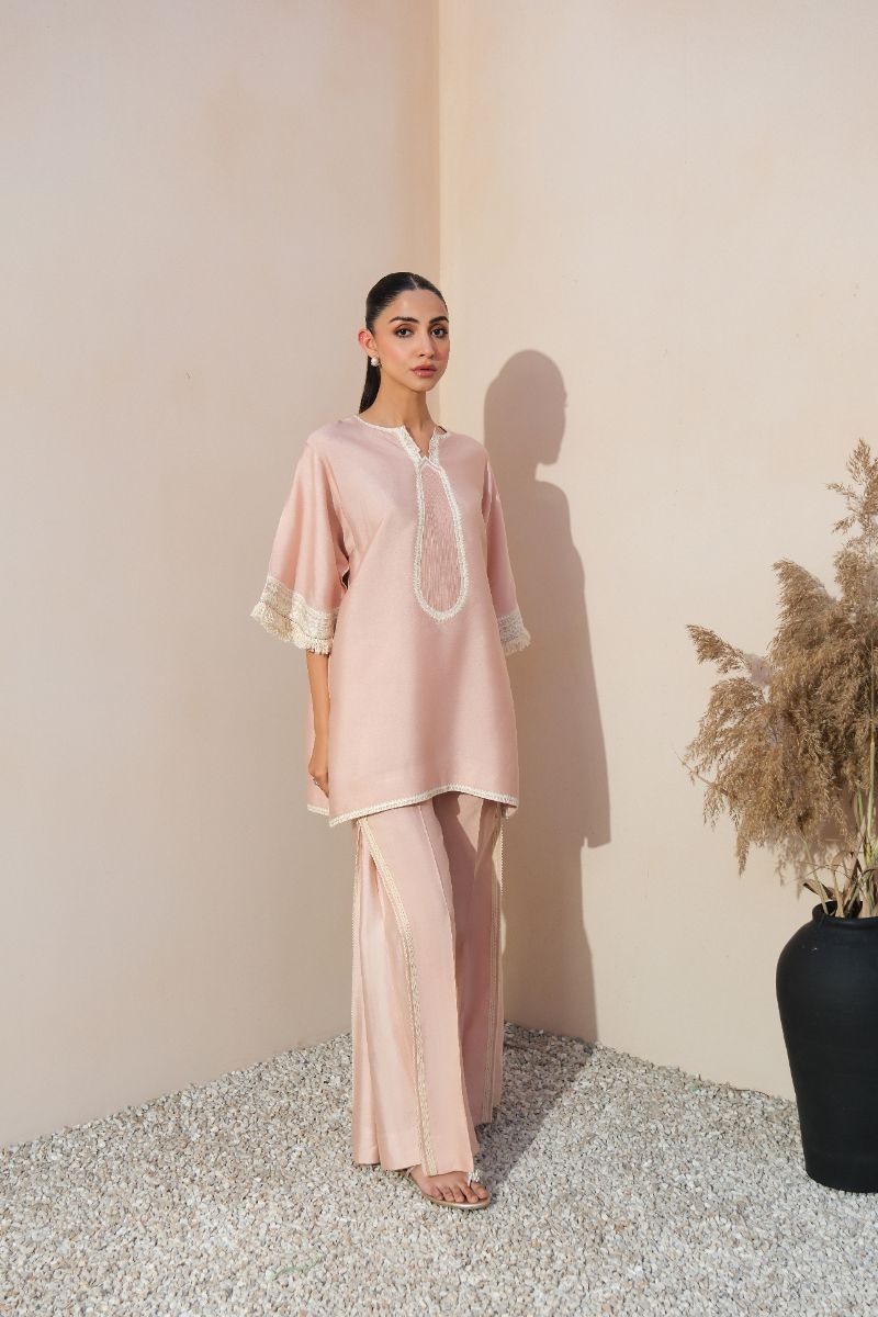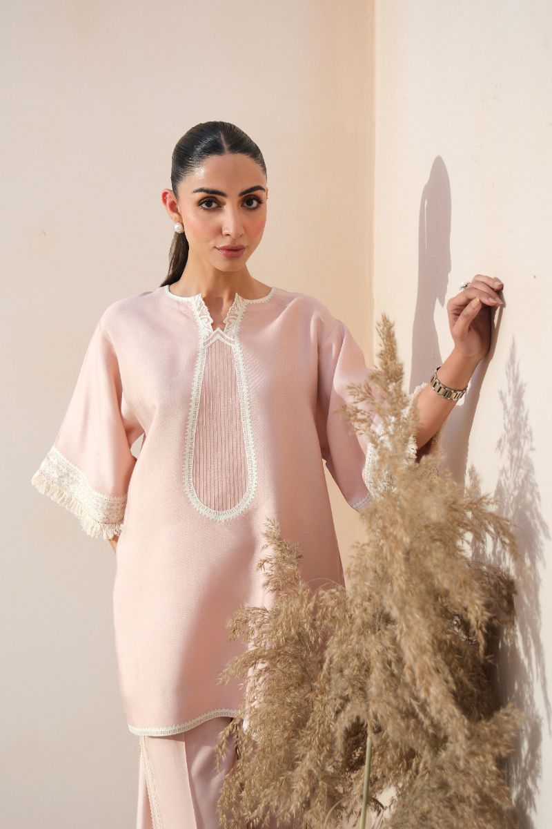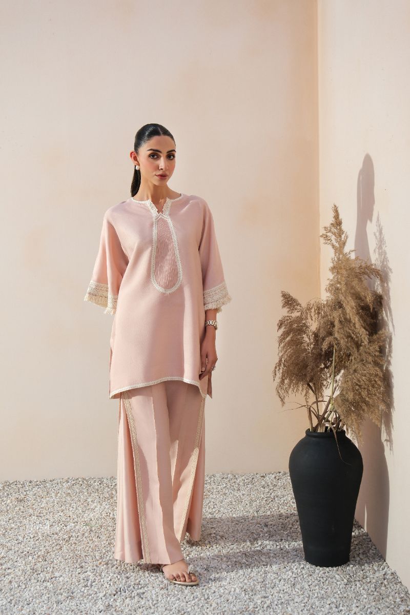 A graceful expression of understated luxury, this blush pink ensemble is tailored in a fluid, lightweight fabric for effortless wear. The straight-cut shirt features a delicately detailed embroidered neckline and lace-trimmed sleeves, adding a refined feminine touch. Subtle finishing along the hem enhances the clean silhouette. Paired with coordinated trousers accented with tonal lace inserts, the look is timeless and versatile—ideal for daytime gatherings, intimate festivities, or elegant everyday dressing.