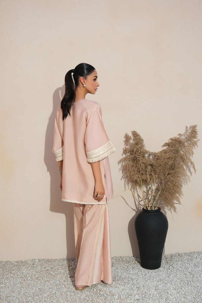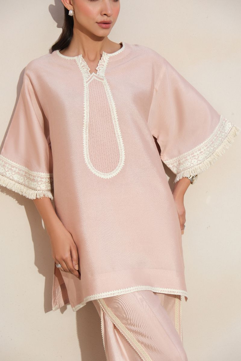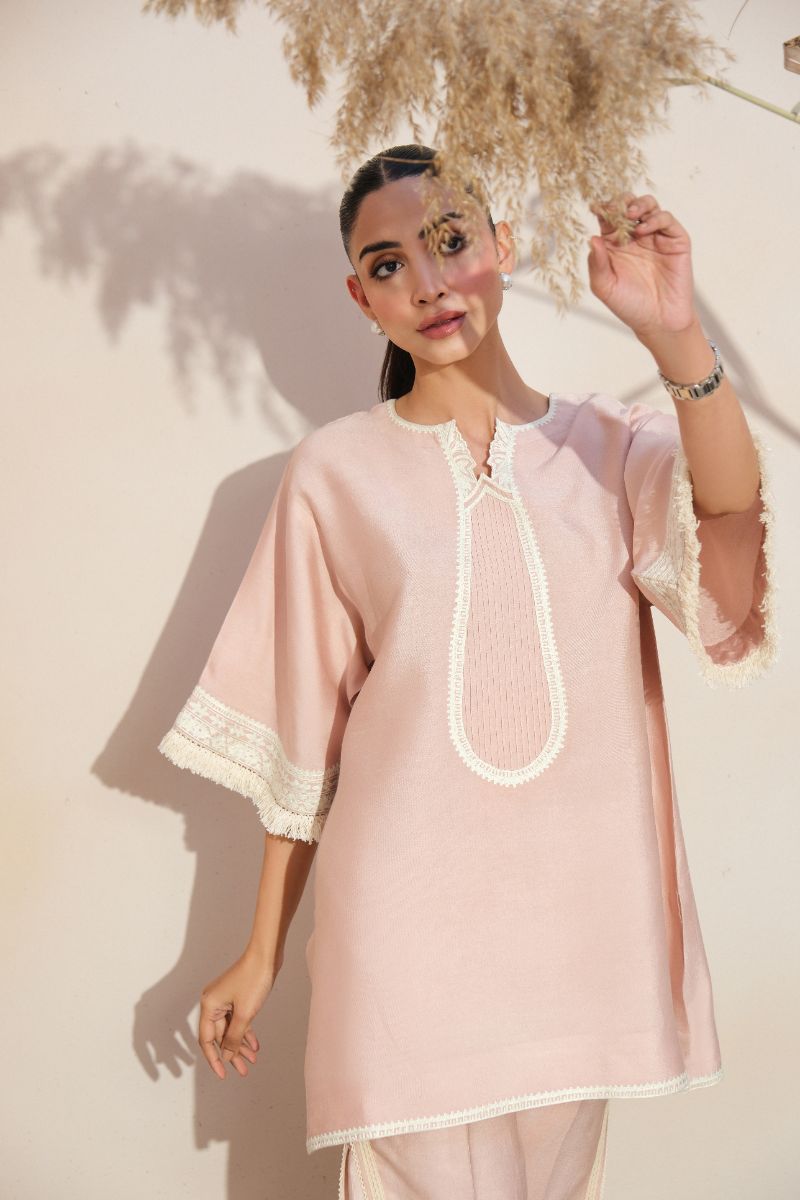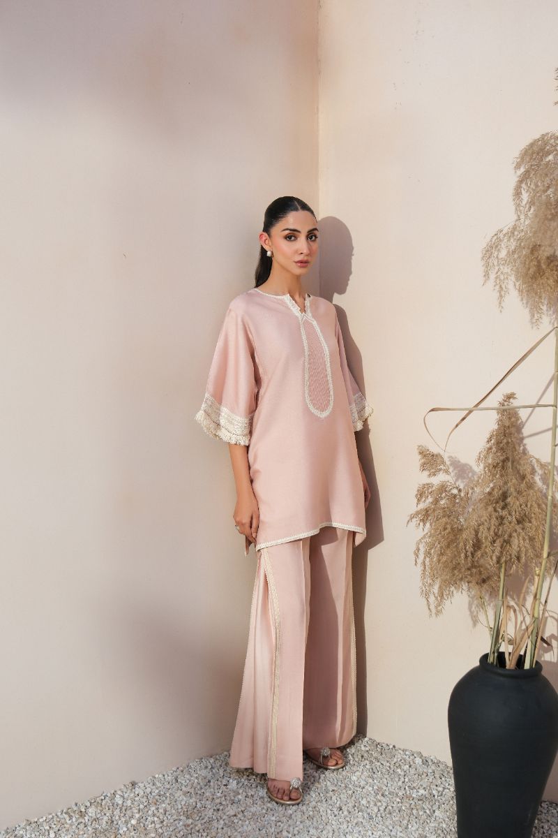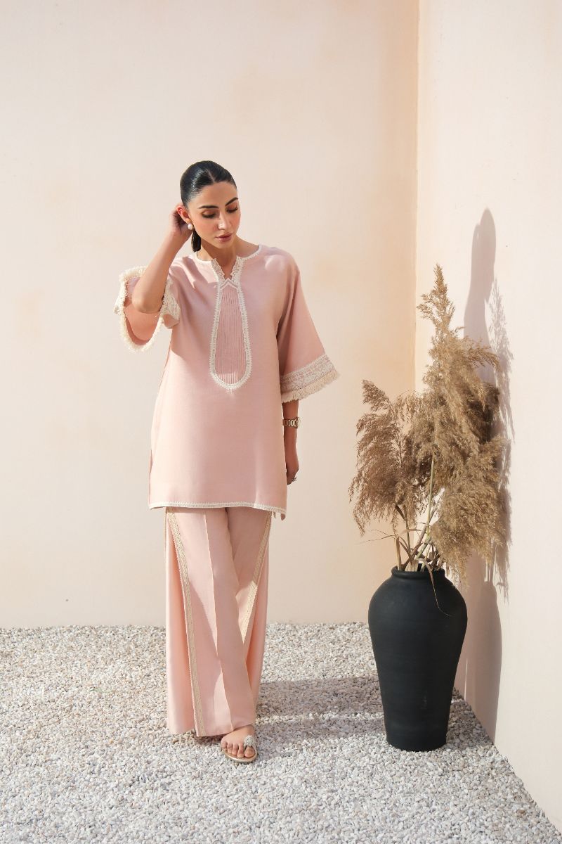 A graceful expression of understated luxury, this blush pink ensemble is tailored in a fluid, lightweight fabric for effortless wear. The straight-cut shirt features a delicately detailed embroidered neckline and lace-trimmed sleeves, adding a refined feminine touch. Subtle finishing along the hem enhances the clean silhouette. Paired with coordinated trousers accented with tonal lace inserts, the look is timeless and versatile—ideal for daytime gatherings, intimate festivities, or elegant everyday dressing.