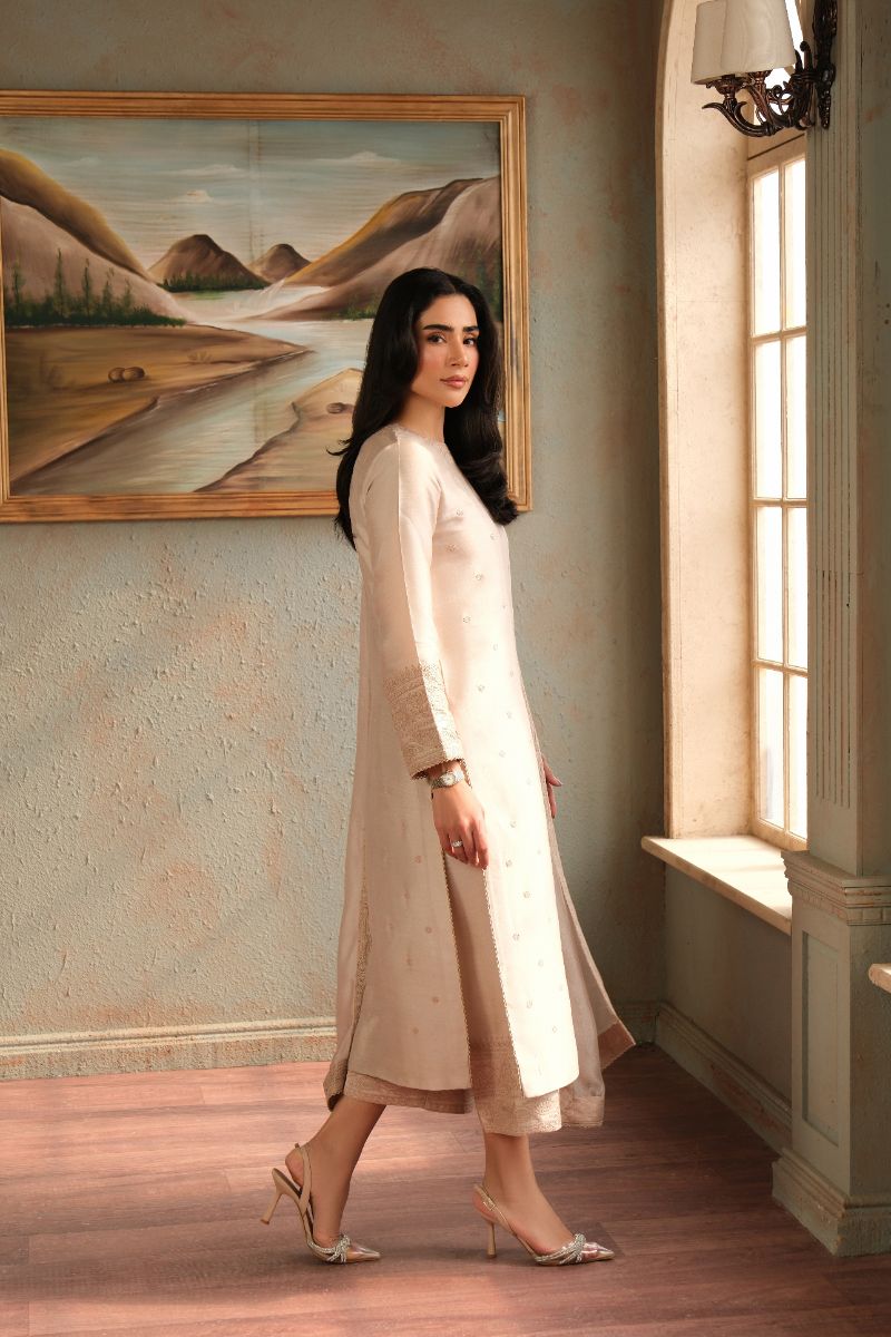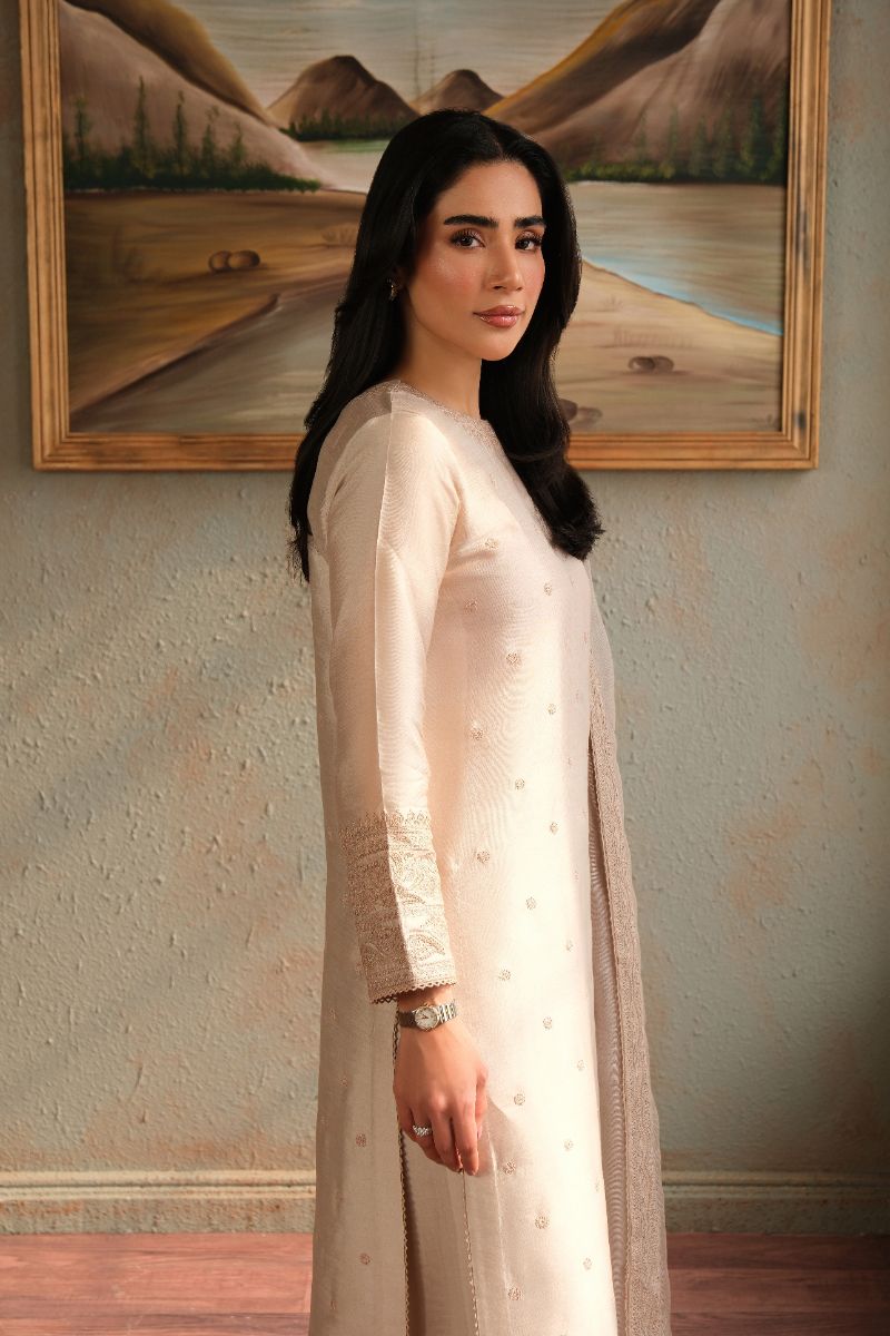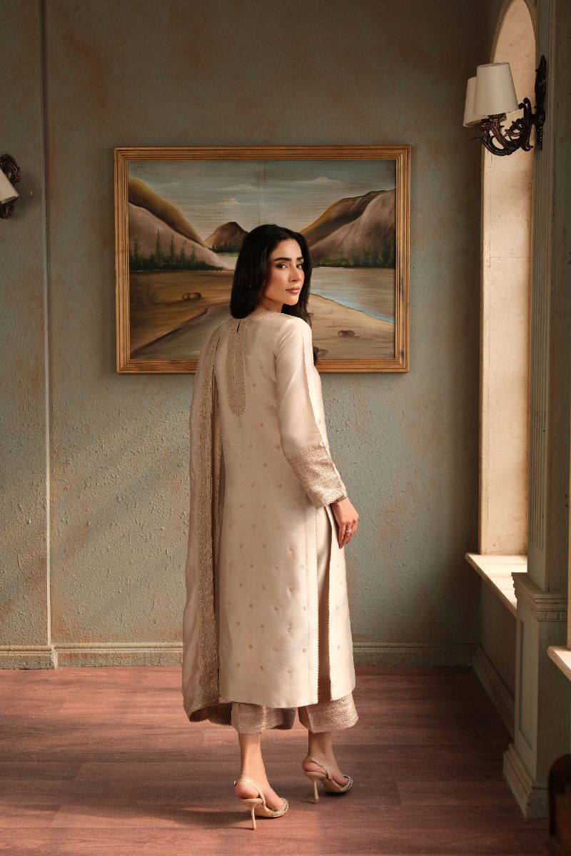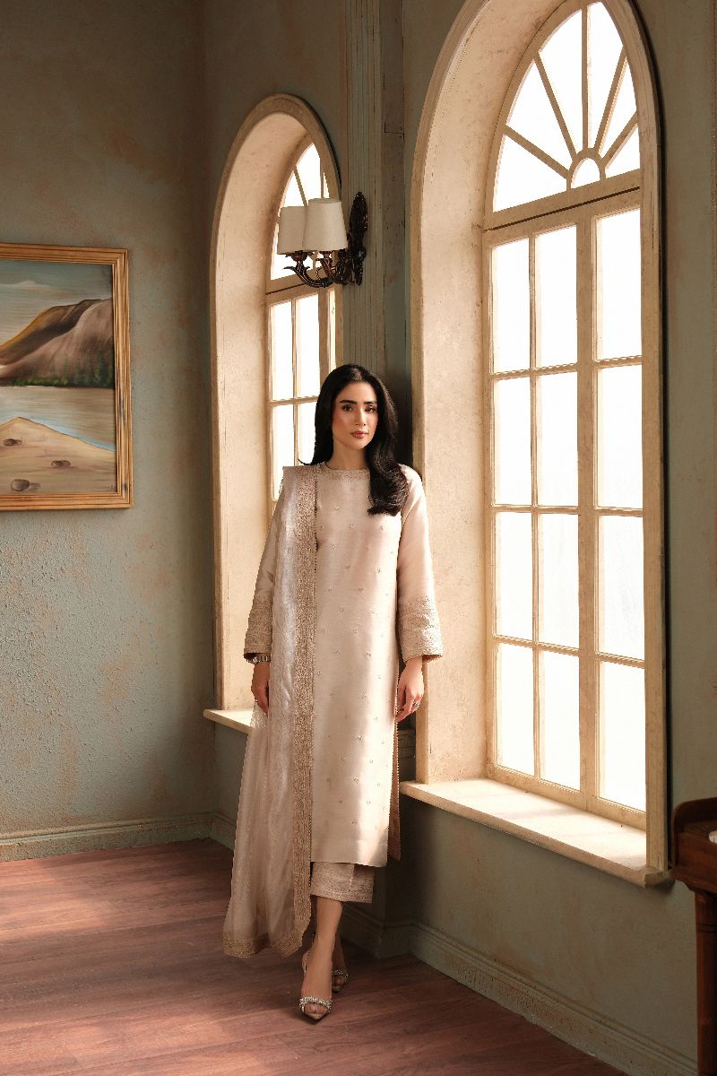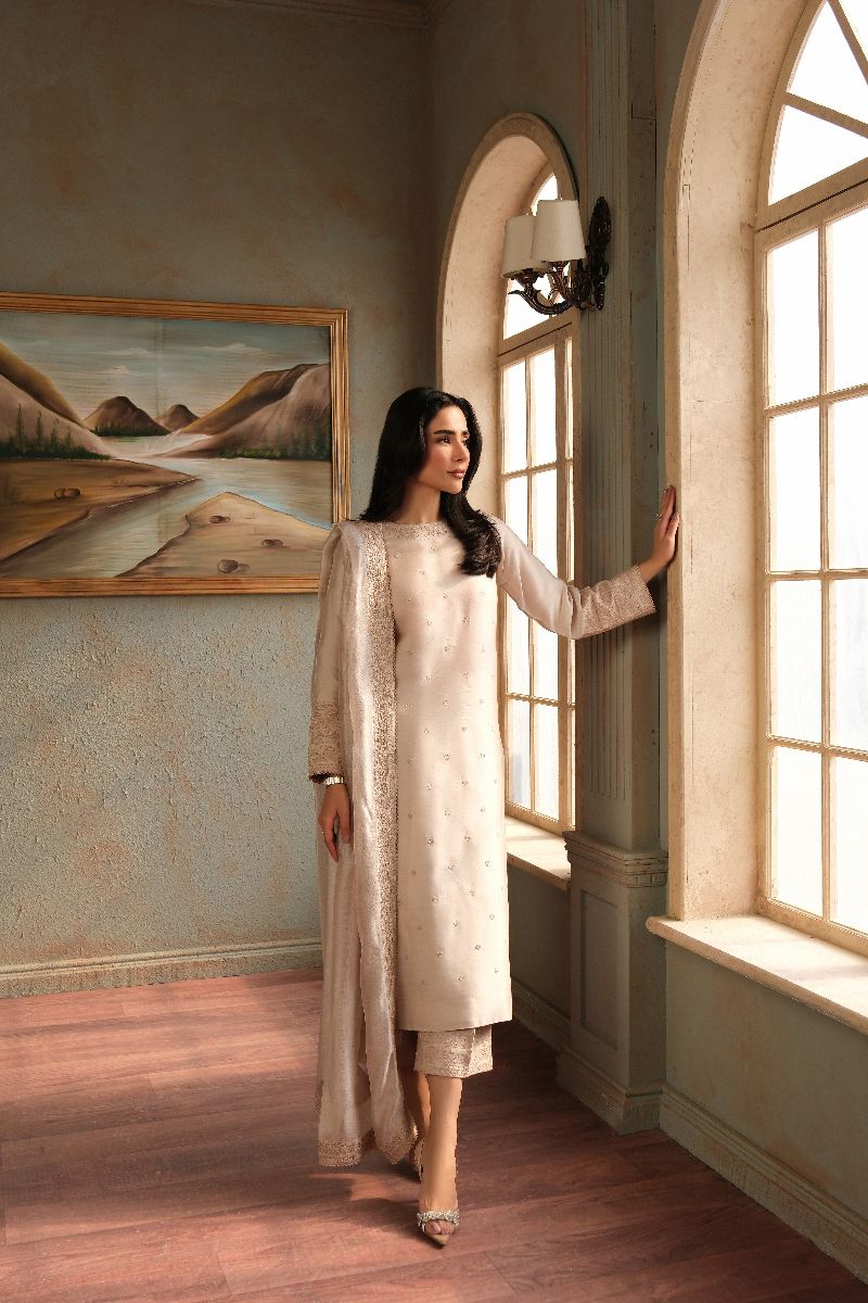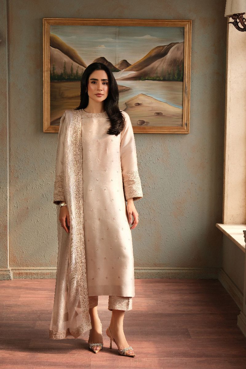An ode to timeless elegance, this soft blush ensemble is crafted in a straight, graceful silhouette adorned with delicate tonal embroidery scattered across the canvas. The sleeves and neckline are finished with subtle textured detailing, adding depth without overpowering the design. Paired with matching trousers and a sheer, fluid dupatta edged with fine borders, this look exudes quiet sophistication—perfect for intimate festivities, formal lunches, or evenings that call for refined simplicity.