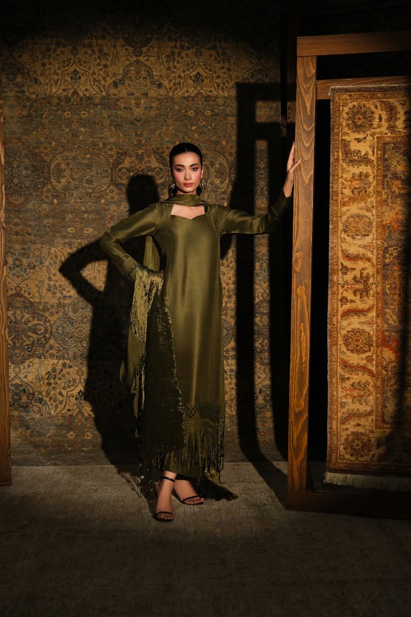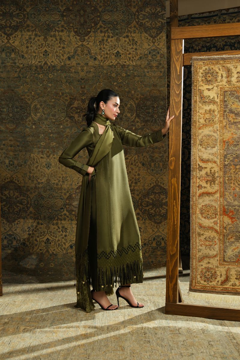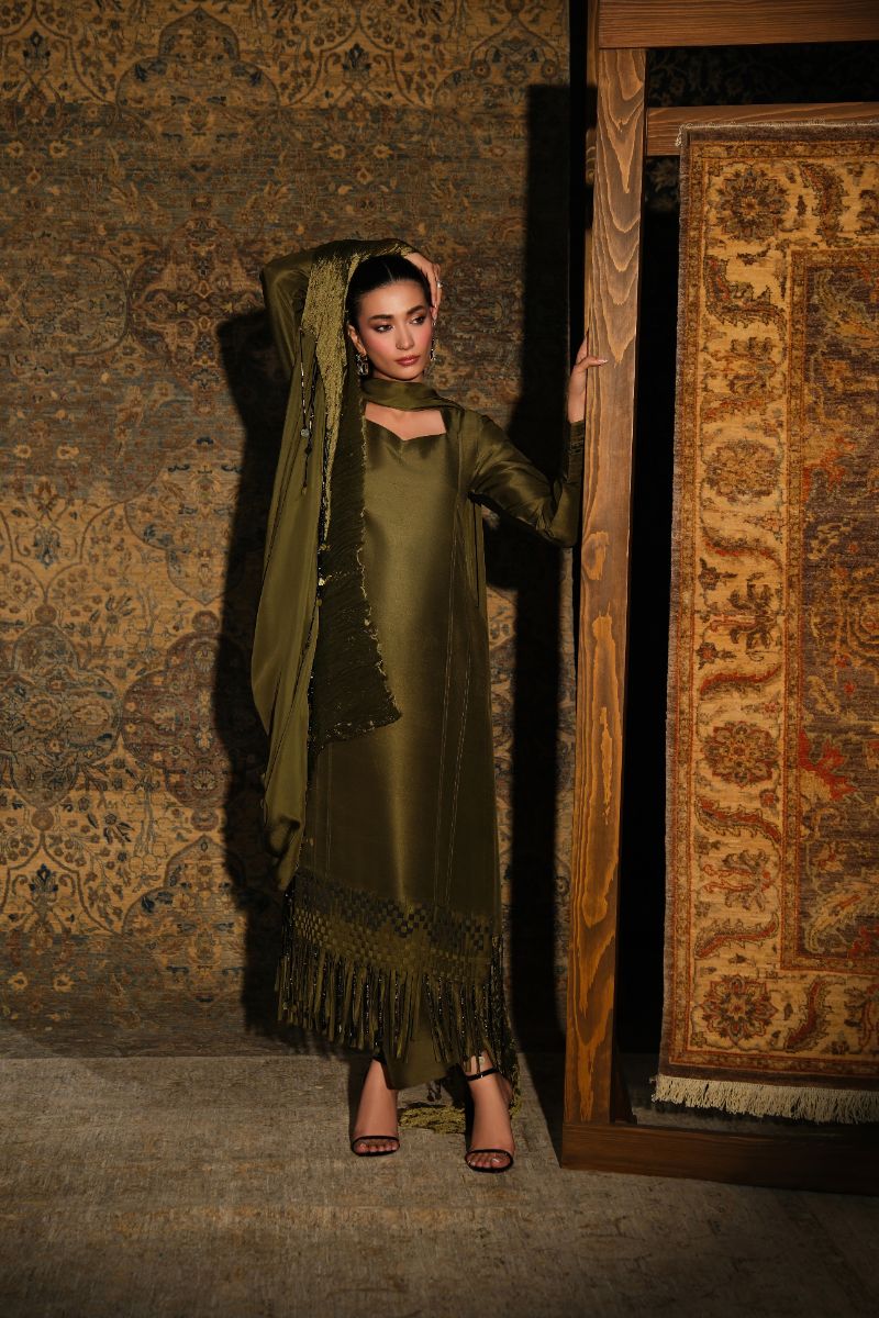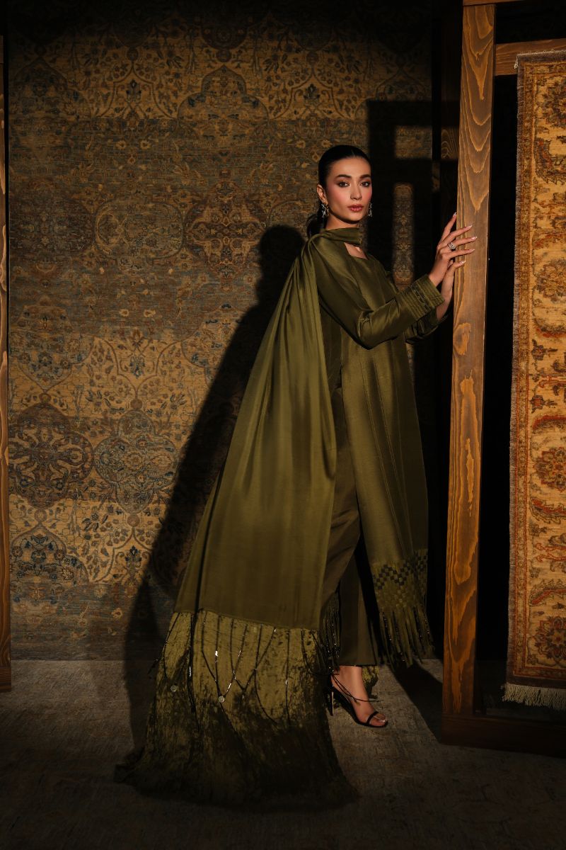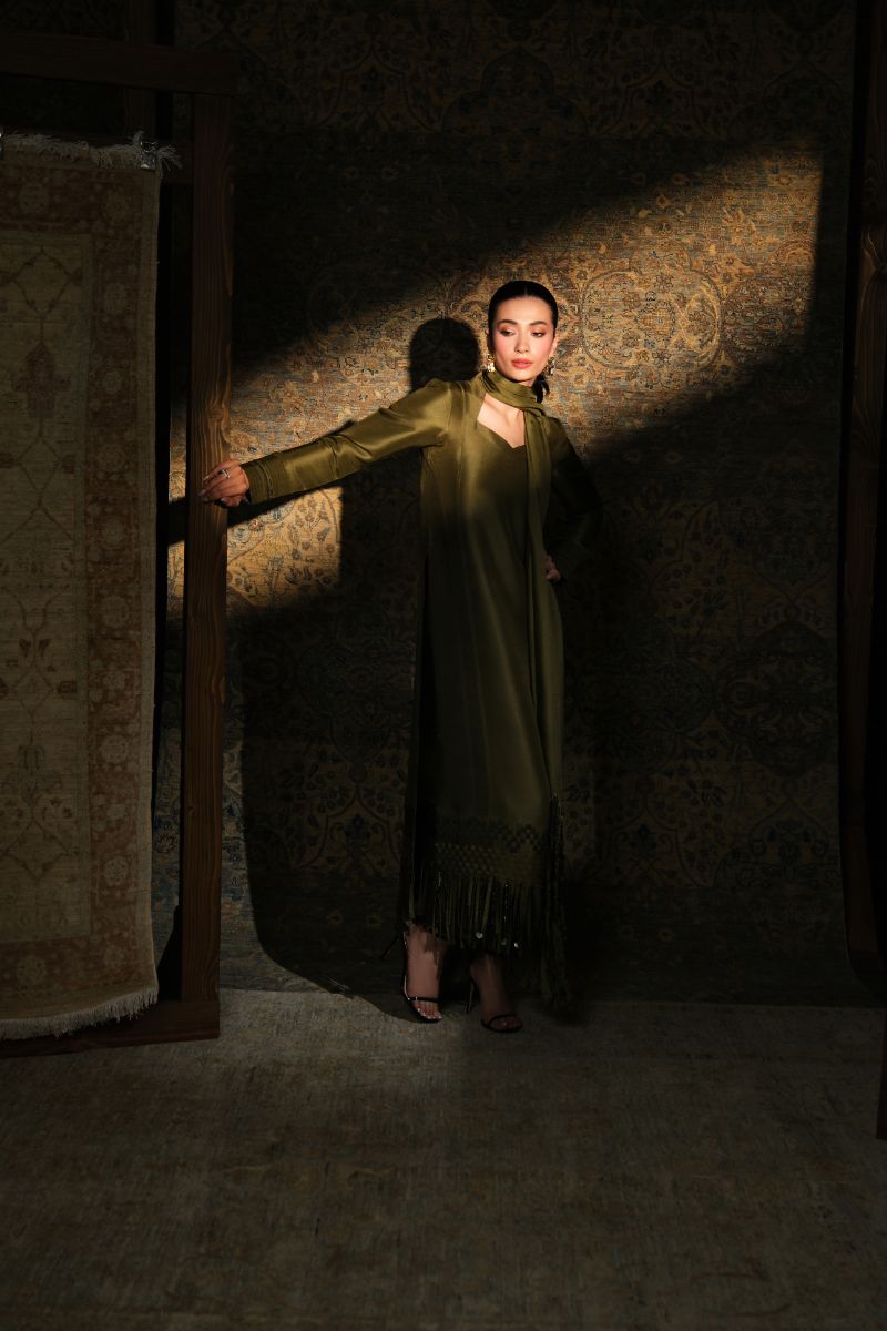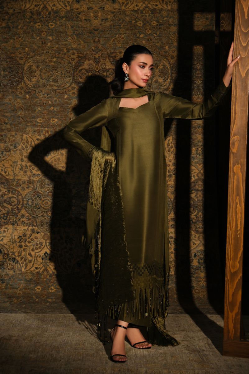 This deep olive outfit blends classic charm with modern finesse. The long, fluid silhouette features a sleek cut-out neckline and a beautifully woven fringe hem that adds movement and detail. Finished with subtle cuff embroidery and a softly draped matching dupatta, it’s a refined look made for winter evenings and graceful celebrations.