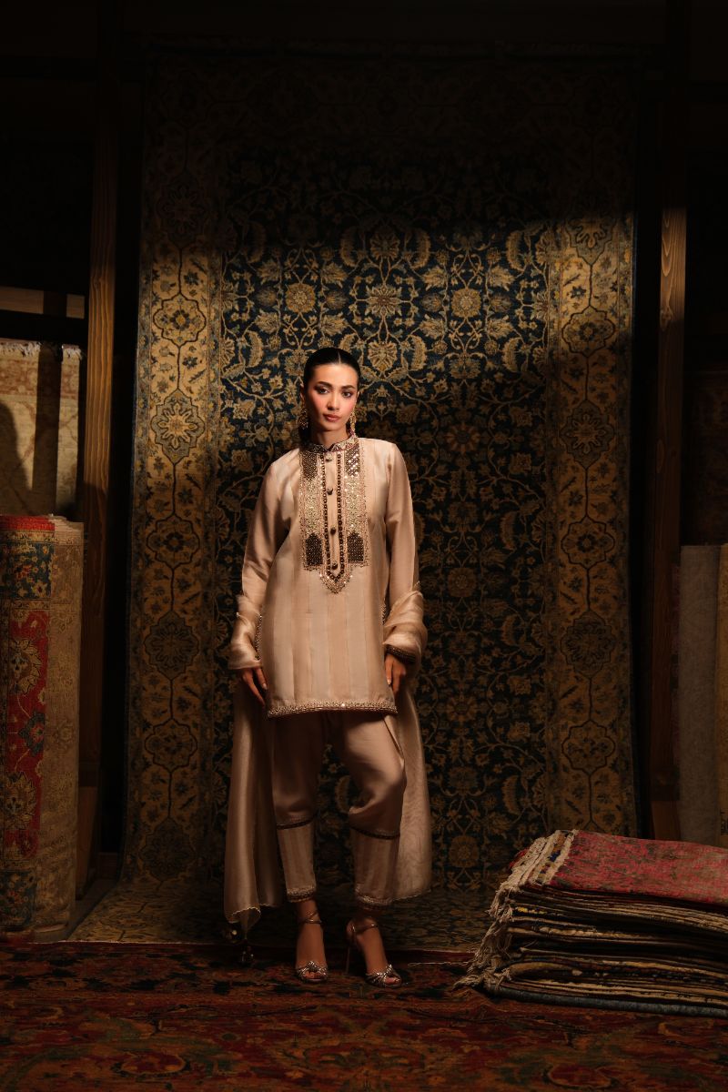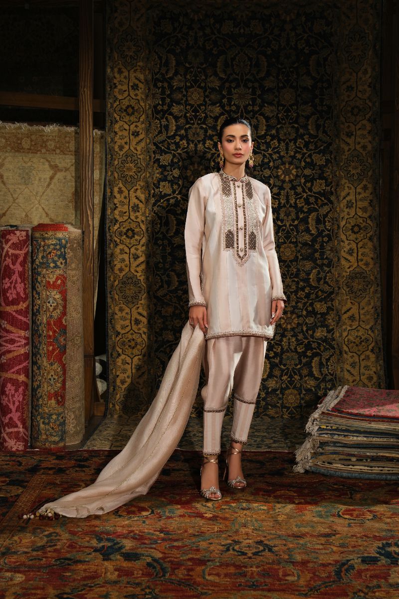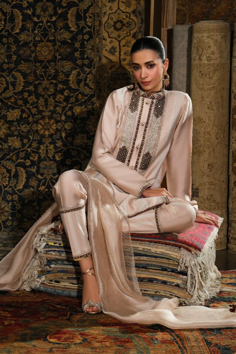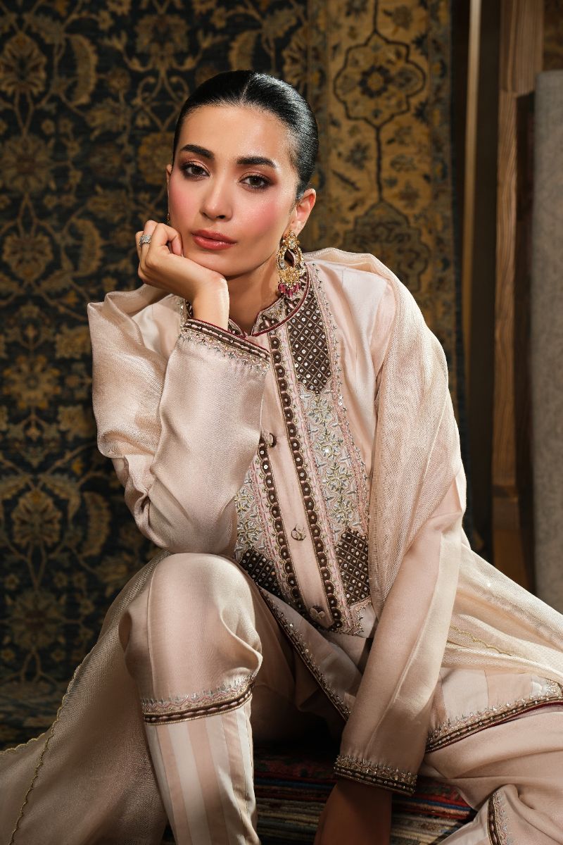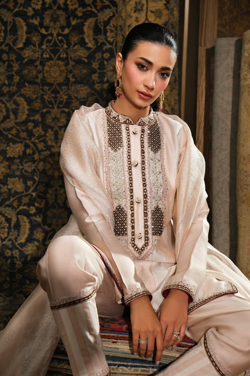 This soft blush ensemble brings a refined, heritage charm. The straight kurta features intricate mocha-toned embroidery inspired by Kashmiri and Persian motifs, adding delicate detail without overpowering the silhouette. Paired with tailored striped trousers and a lightweight matching dupatta that drapes effortlessly, the outfit blends tradition with a fresh, modern softness. Perfect for daytime festivities, intimate gatherings, or any moment that calls for understated elegance.