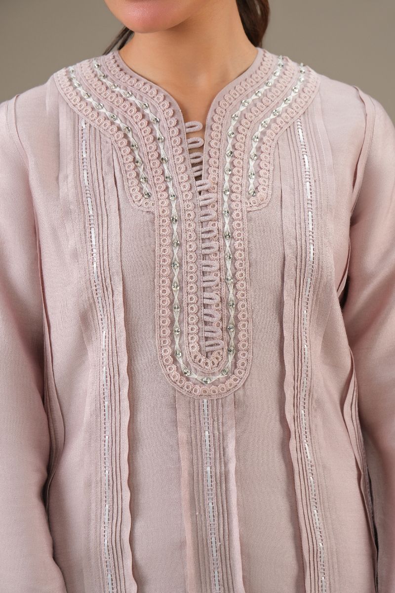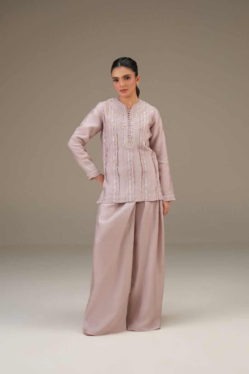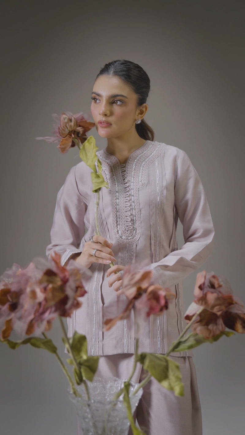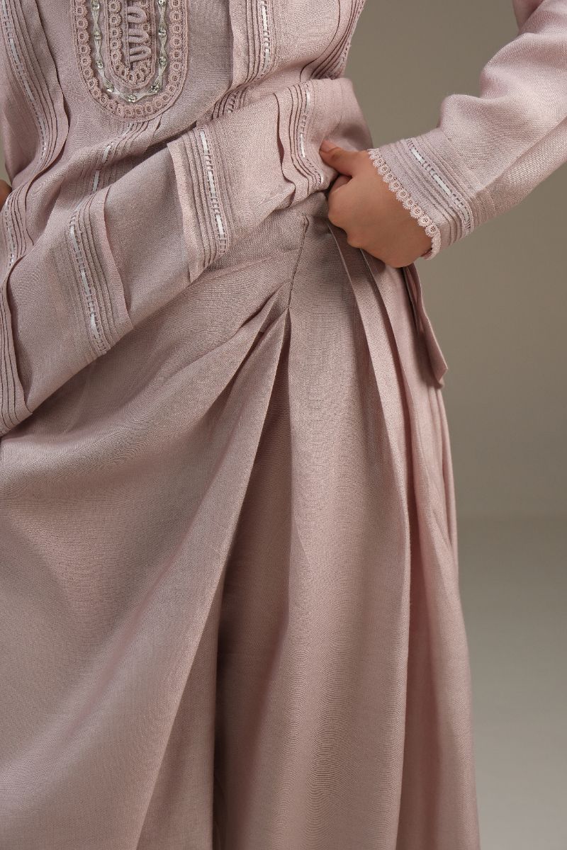 Refined and graceful, this dusty mauve ensemble blends traditional embroidery with a modern silhouette. The long-sleeved kurta features intricate threadwork along the neckline and vertical panels, adding depth and elegance to the design. Paired with wide-legged trousers, the outfit offers both sophistication and comfort, making it a versatile choice for semi-formal occasions or elevated everyday wear.