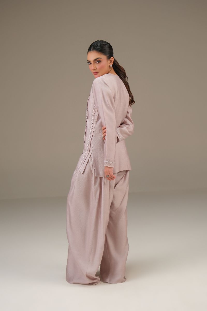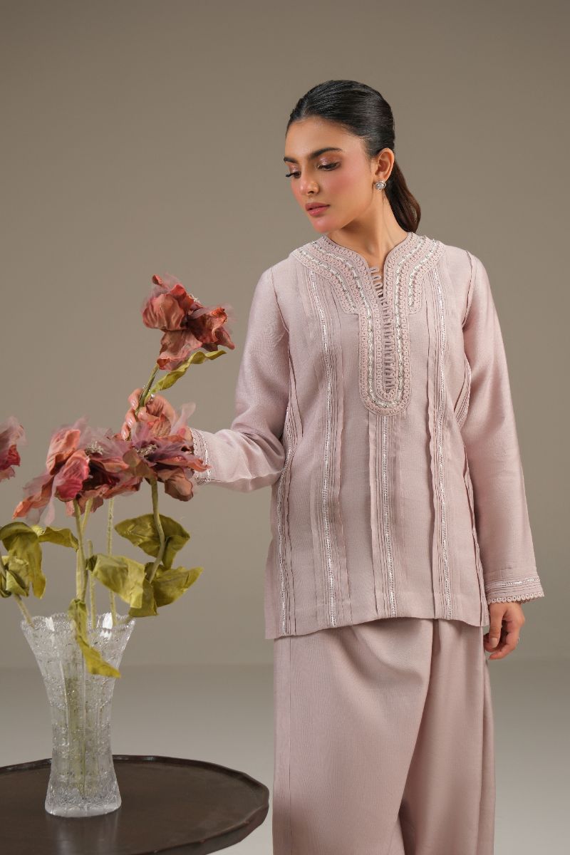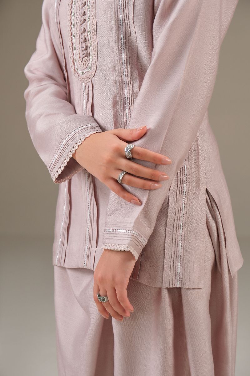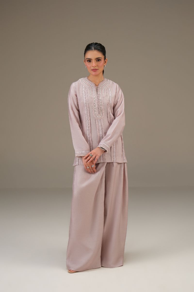 Refined and graceful, this dusty mauve ensemble blends traditional embroidery with a modern silhouette. The long-sleeved kurta features intricate threadwork along the neckline and vertical panels, adding depth and elegance to the design. Paired with wide-legged trousers, the outfit offers both sophistication and comfort, making it a versatile choice for semi-formal occasions or elevated everyday wear.