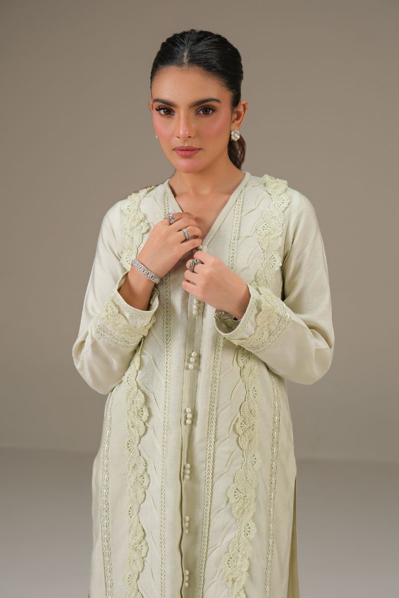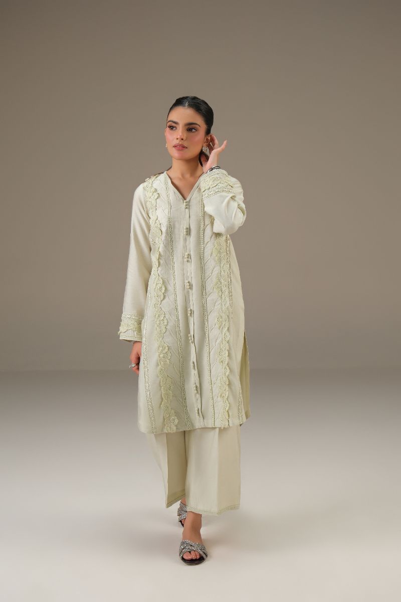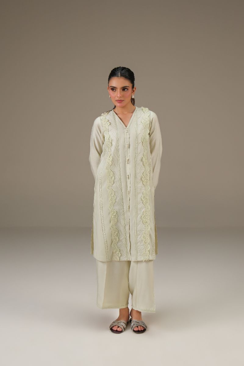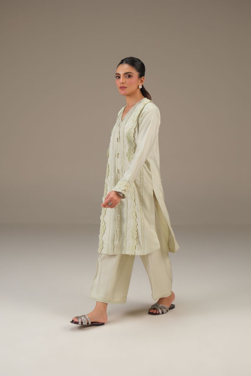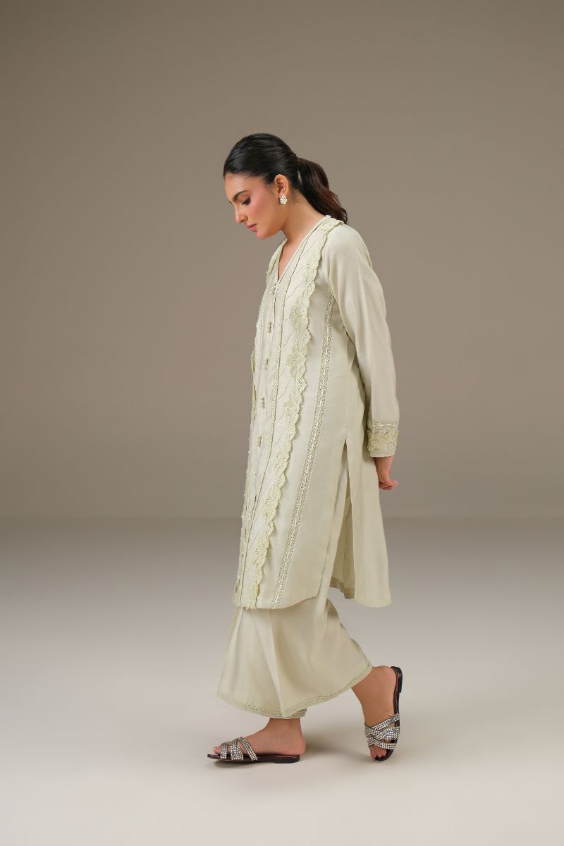 Step into effortless elegance with this refined two-piece set, crafted in a soft pastel hue. The straight-cut shirt features delicate lace appliqué detailing along the front, enhanced with subtle embroidery and button accents for a timeless look. Paired with wide-legged trousers, the ensemble strikes the perfect balance between grace and comfort.