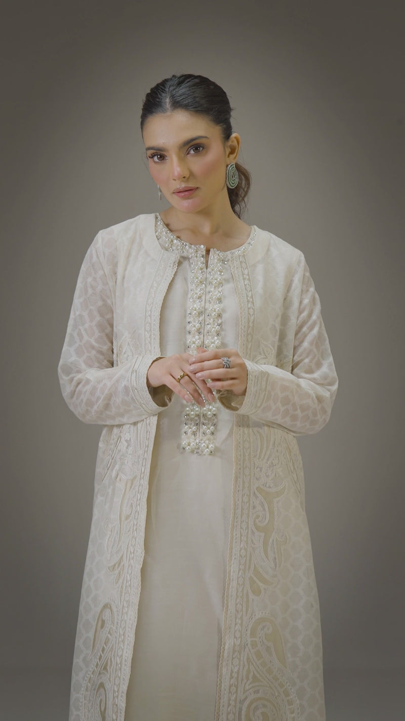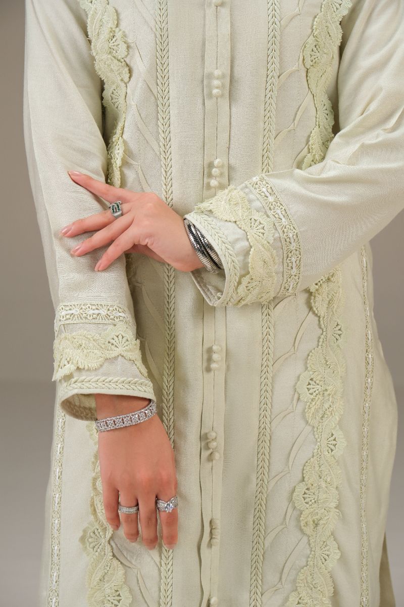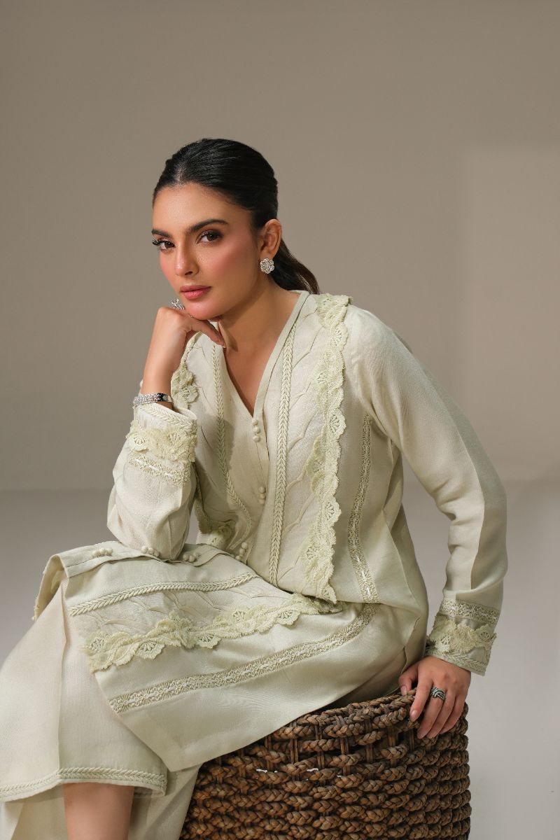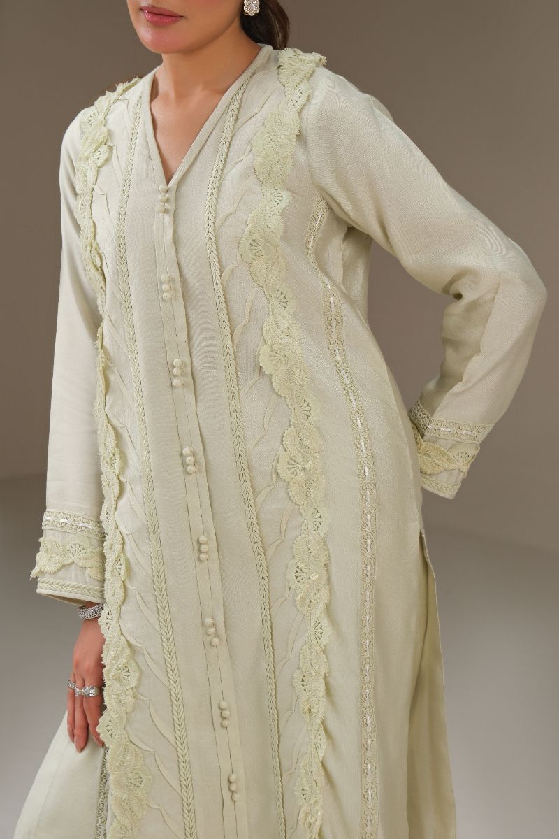 Step into effortless elegance with this refined two-piece set, crafted in a soft pastel hue. The straight-cut shirt features delicate lace appliqué detailing along the front, enhanced with subtle embroidery and button accents for a timeless look. Paired with wide-legged trousers, the ensemble strikes the perfect balance between grace and comfort.