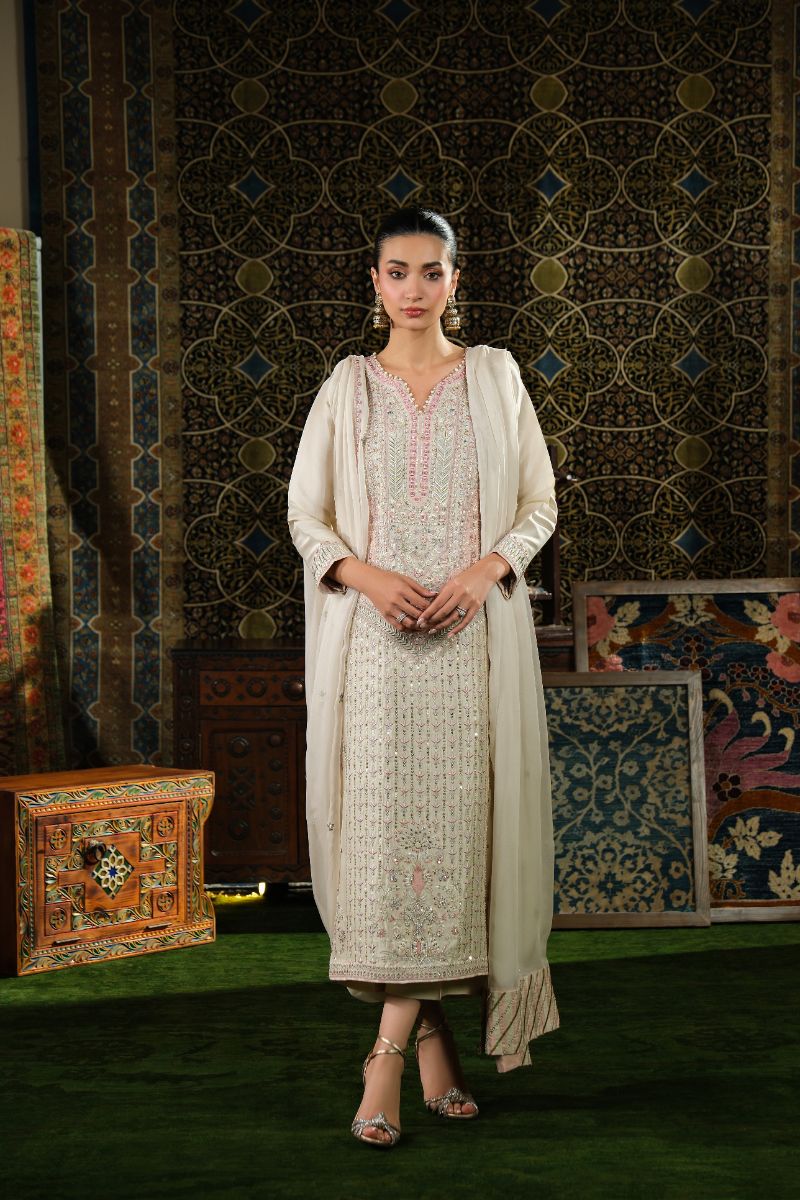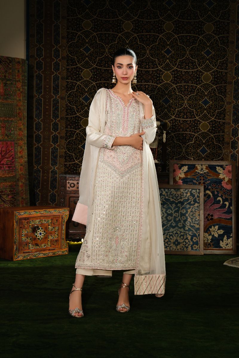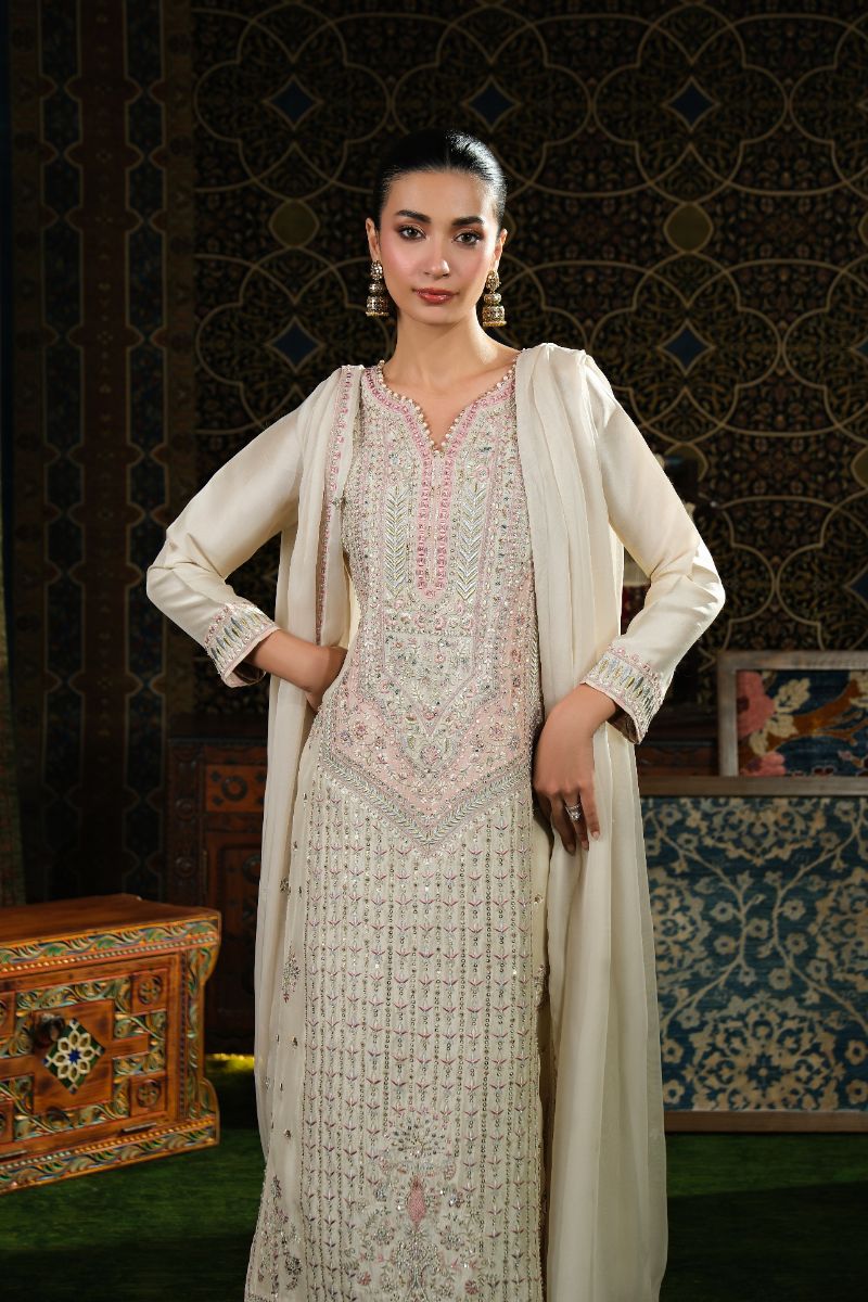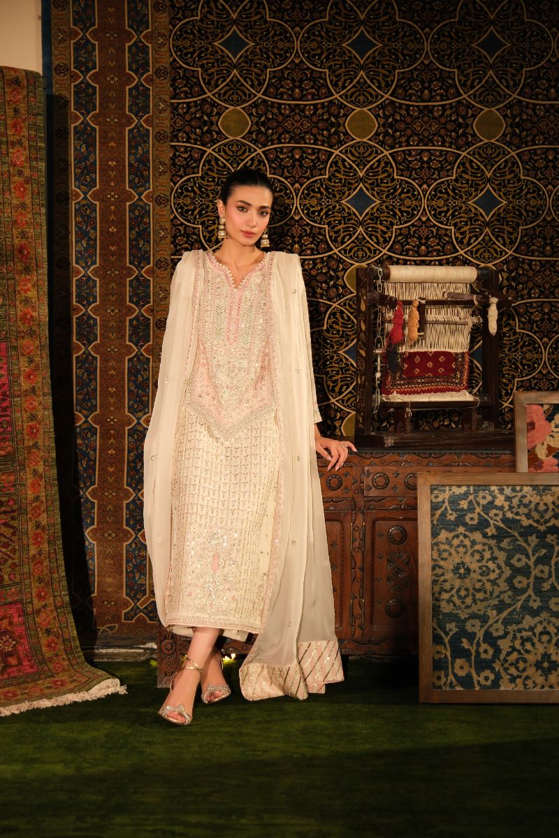 his timeless ivory ensemble is adorned with exquisite Kashmiri tanka and delicate handwork, creating an artwork of intricate details from neckline to hem. Soft hints of pink and silver embroidery add a graceful pop of color, enhancing the refined craftsmanship. The look is completed with a flowy chiffon dupatta featuring classic chatta pati work, lending a traditional yet elevated touch. Paired with a sleek long overlay and subtle embellishments, this outfit blends heritage techniques with modern sophistication—perfect for festive occasions and graceful evening wear.