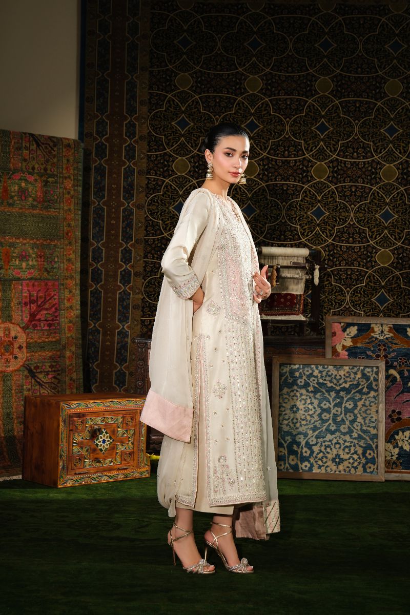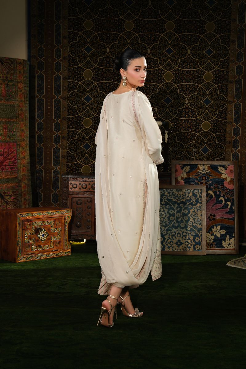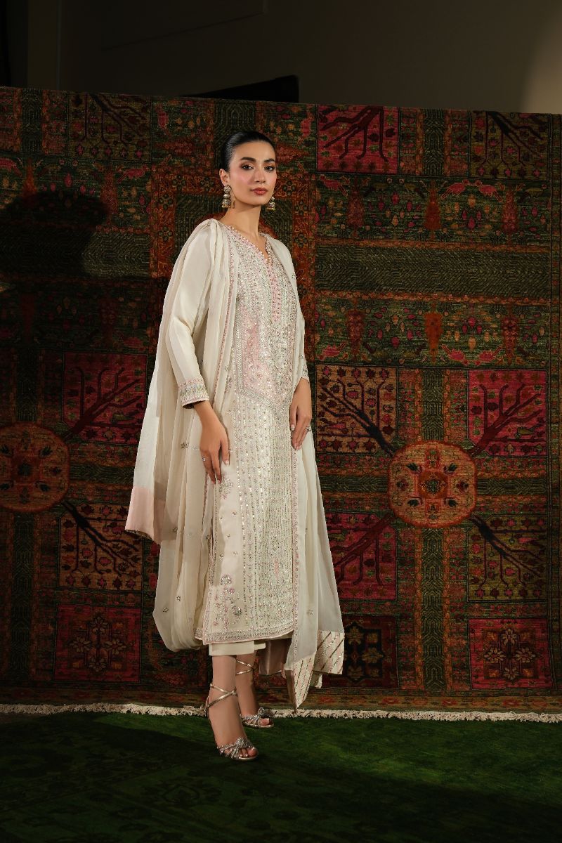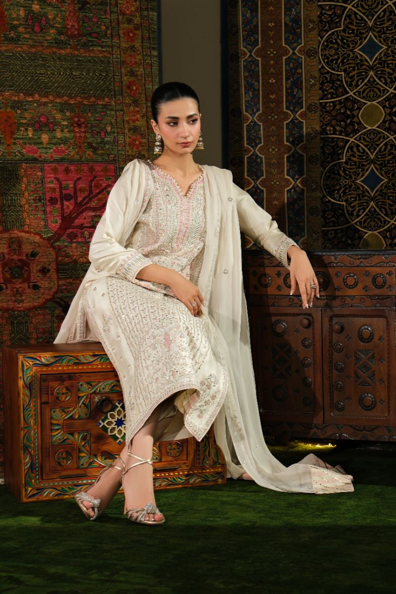 his timeless ivory ensemble is adorned with exquisite Kashmiri tanka and delicate handwork, creating an artwork of intricate details from neckline to hem. Soft hints of pink and silver embroidery add a graceful pop of color, enhancing the refined craftsmanship. The look is completed with a flowy chiffon dupatta featuring classic chatta pati work, lending a traditional yet elevated touch. Paired with a sleek long overlay and subtle embellishments, this outfit blends heritage techniques with modern sophistication—perfect for festive occasions and graceful evening wear.